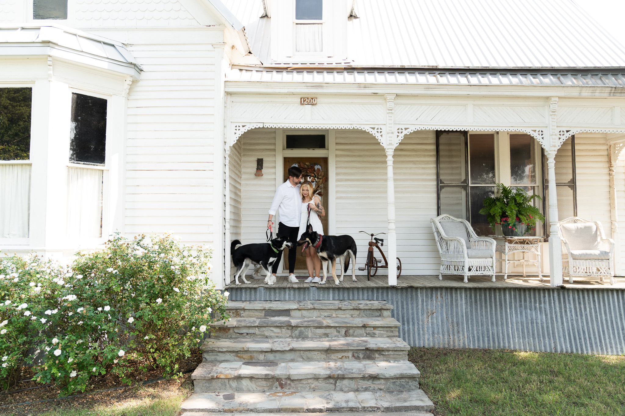 The golden light made everything glow as Brooke and Drew cuddled up on the farmhouse porch, played with Rocky and Yoshi in the open yard, and soaked in this exciting season of life. You can truly see how much fun these two have together—and how much love they share with their dogs. Their session was the perfect mix of playful, sweet, and heartfelt moments, exactly what engagement photos should be.